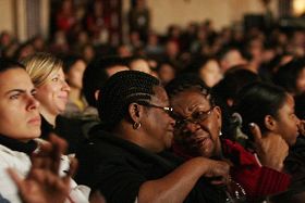 ![]() 纽约来音合唱团的指挥、女歌唱家王惠津说,晚会节目《觉醒》表达的信息很清晰:一些人只是在过日常的生活,例如在公园里炼功,却遭到迫害,但人们最终都能站出来维护正义和良知,表现了邪不压正的主题。她说,编导水准高,使得人们不需琢磨,就能看明白发生在法轮功身上的事情。 |