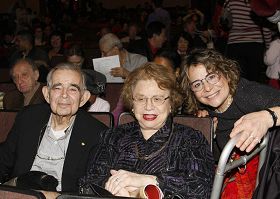 ![]() 曾任教三十五年音乐的斯克劳斯(Mirian Schloss)(右)与父母。她的母亲莱文恩(Bernice Levine)年轻时是芭蕾舞业余演员。莱文恩认为,中国舞蹈更胜于芭蕾。斯克劳斯是第一次欣赏到中西乐器的合奏。她说:“西洋乐与中国乐器结合奏出的旋律,真的是非常复杂,非常富有生动的表现力,更有深度,更好的表达历史。” |