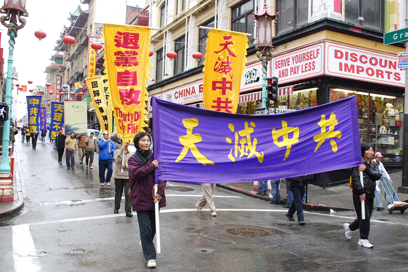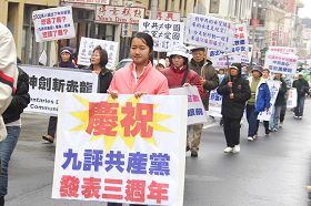 12月29日,旧金山数百人士在市政广场集合,细雨中展开了庆祝三千万退!党!活动。游行队伍在交警协护下,沿闹市区商业大街(Market St.)前往中国城,后在花园角举行集会。