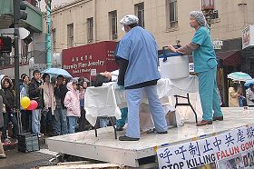 雨中的集会穿插了舞龙舞狮和明慧学校学生的文艺表演。一旁还设置了法轮功学员反酷刑展,和活体摘取法轮功学员器官展。张雪容指出,现在中共把法轮功学员的器官卖给日本,它不但出卖中国的国土,现在还在卖中国人的心。