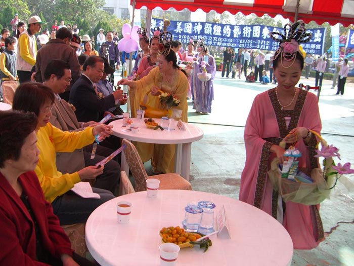 活动现场同时有美丽的仙女发送「法轮大法好」的莲花书签,仙女们并传递「神韵艺术团」到台湾演出的讯息。高雄县长杨秋兴及路竹乡乡长王和雄和多位贵宾很高兴的微笑点头收下,现场与会民众一直前来索取,供不应求,莲花书签大受民众喜爱。