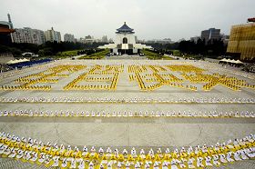 ![]() 二零零七年五月十三日,五千名学员在台北市中正纪念堂广场集体炼功,排出“恭祝师尊生日快乐”字形,向李洪志老师祝寿 |