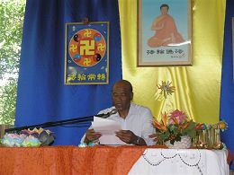 ![]() 法会期间,学员们在附近景点集体炼功,和游人交谈 |