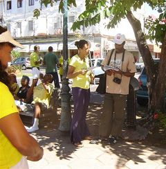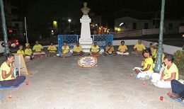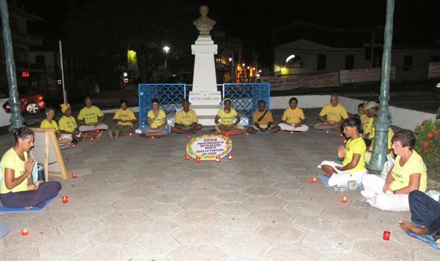 晚上,学员们在维克多∙朝勒税广场(Victor Schoelcher)举行了烛光守夜活动。维克多•朝勒税是一个历史人物,他曾为废除安德烈斯群岛的奴隶制做出过贡献。广场在巴斯戴赫市市政府前面,烛光守夜是为了悼念那些在中国因坚持对“真善忍”的信仰而无辜被中共迫害致死的法轮功学员。