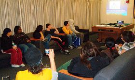 ![]() 大学生们认真的观看揭露迫害的投影图片 |