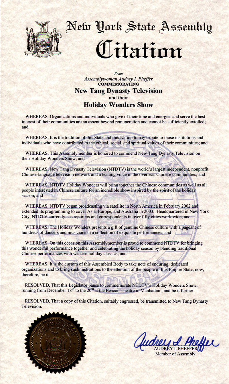 鉴于,本议员在此很自豪的表彰新!唐!人:电视台,表彰他们编排出这一美好的演出,并溶合传统的中国表演与西方古典节庆于一体庆祝佳节;并且