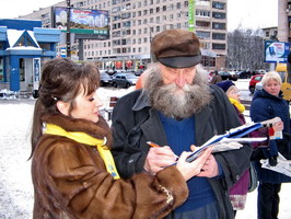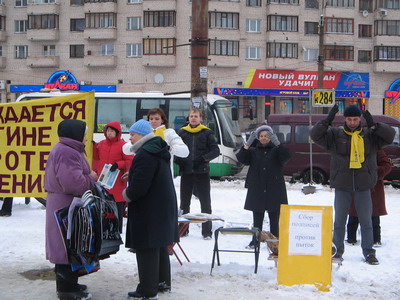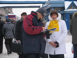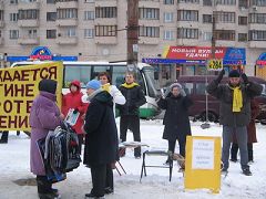 二月三日,学员们在公民大街地铁车站旁边举行活动。一部份人举着横幅,一部份人炼功,其他学员向民众派发真相资料。过往行人非常多,人们对法轮功学员在中国遭受的迫害十分关注,特别是对中共活摘法轮功学员器官牟利的罪恶感到震惊,纷纷谴责邪恶中共的暴行。很多人签名支持法轮功反迫害,并对俄文版的《·九·评*共产党》非常感兴趣,学员放在桌子上的一大包俄文《·九·评*共产党》很快就被拿光了。