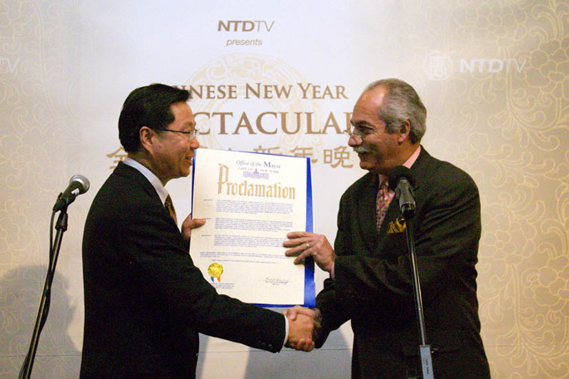 ![]() 图说:纽约市长彭博定2007年2月14日为“新!唐!人:华人新年晚会日”。图为纽约市长办公室移民事务局局长格维勒默•李纳尔斯(GUILLERMO LINARES)代表市长彭博向新!唐!人:总裁李琮颁发褒奖。 |