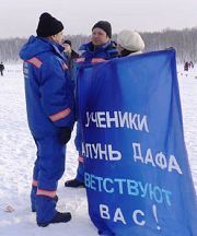 ![]() 学员打着“法轮大法弟子向你问好”的横幅向运动员讲真相 |