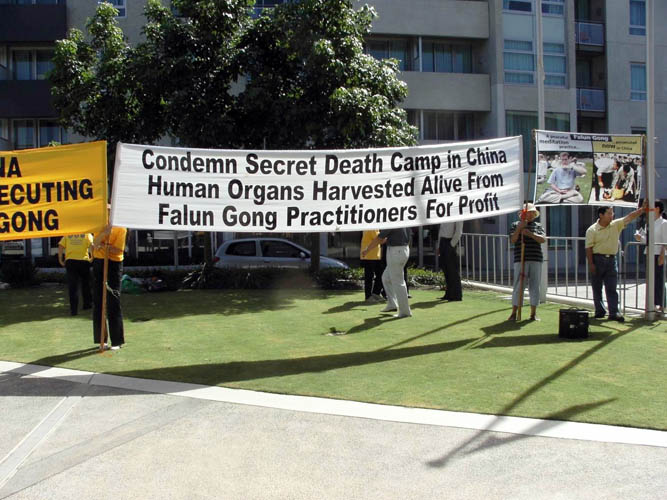 自大会开始的首日,西澳法轮功学员就在会场的大门口拉开大型横幅,呼吁所有的亚太经济合作组织成员国共同加入对中共邪*党-活摘法轮功学员器官的深入调查。