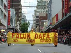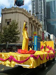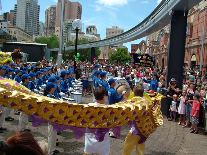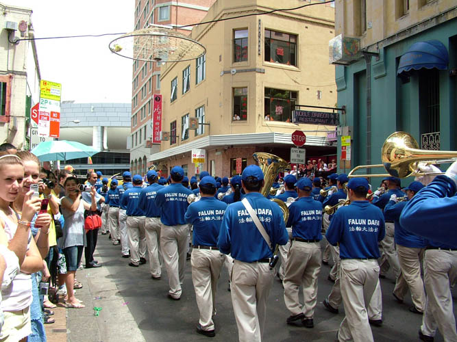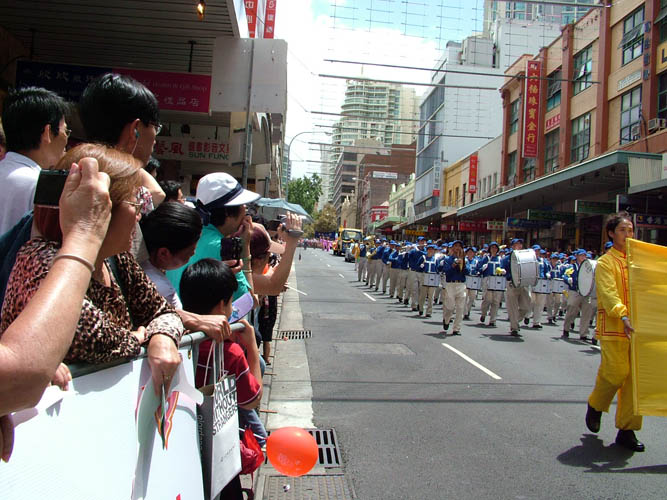 游行的起点是悉尼市政厅前,法轮功学员提前一天向警方申请在市政厅马路对面的空地上乐团演奏。当天,天国乐团、腰鼓队的学员早早的就来到现场,打出“法轮大法好”金字的大横幅。天国乐团蓝色的方阵和腰鼓队的金黄色方阵在澳洲蓝天白云映衬下格外的引人注目。当天国乐团“法轮大法好”的音符奏响,气势磅礴直冲云霄,横扫一切阴霾。军乐声、鼓声交相呼应,使陆续前来参加游行的人们和观赏游行的民众全都沐浴在“法轮大法好”的音乐声中,一遍又一遍启迪和震撼人们的心灵。尤其那些从大陆来的参加游行的民众也被深深的震撼着,神情由茫然、错愕进而陷入沉思。