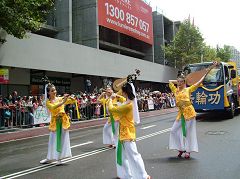 悉尼唐人街中心临时搭建了主席台观看游行队伍。中共驻澳大使傅莹和身着红装的中共驻悉尼总领事邱绍芳也在看台上,当所有的人聚精会神的观看时,突然这二人匆匆离席,原来法轮功队伍马上就要到主席台了。