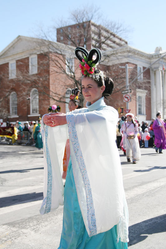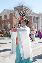 海外华人喜欢把华人的街面称为“唐人街”,暗喻自己是唐人,大唐的后代。大唐是中华民族最值得骄傲的一个开元盛世,四方朝贺,万民同乐。法轮功学员为游行准备了唐装仕女服,不仅仅为了展示唐装的雍容华贵,更是为了唤醒华人对自己民族文化深厚内涵的追忆:敬神佛,拜天地,知天命,守礼法。