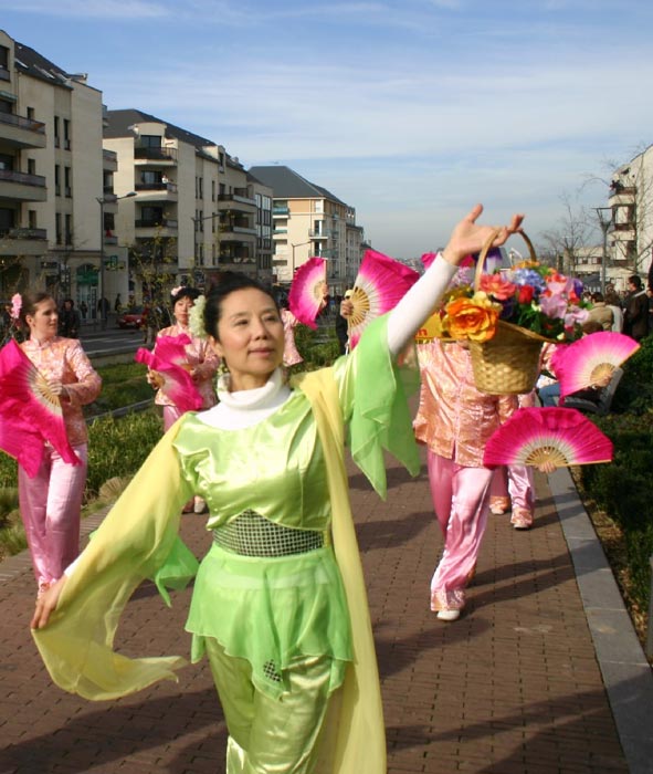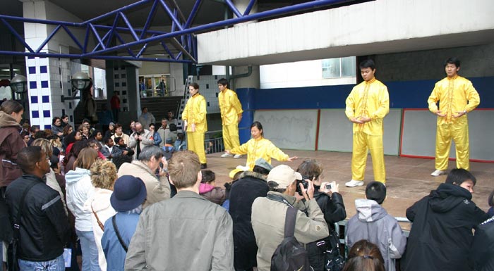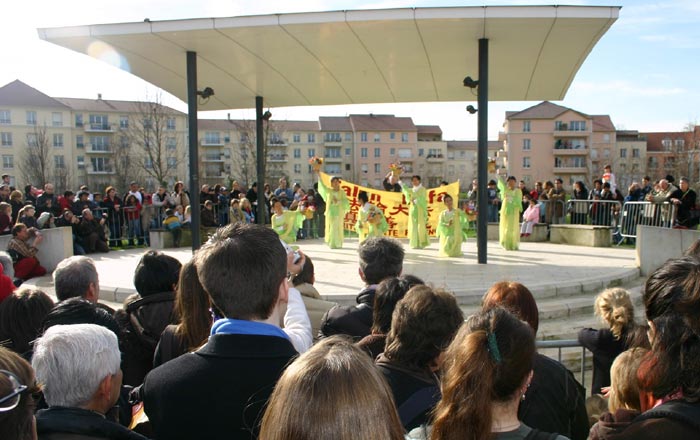 在到达游行目地地——大众之家后,学员们介绍和表演了法轮功的五套功法。功法表演结束后,立即有人要求学炼法轮功。学员们还作了中国历代服饰表演,也获得在场观众热烈掌声。住在诺瓦西勒刚市的亨利•古兰(Henri Goulain)先生在看了表演后说:“我看了介绍法轮功的表演,非常令人感兴趣,因为我已经听过人们谈论气功,能看到人们炼,而且这么近的看,非常有趣。这些舞蹈演员向我们展现了中国文化。服装很漂亮,女孩子们也很柔美。”
