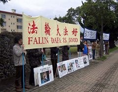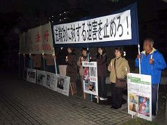 【明慧网二零零七年二月二十一日】二零零七年二月十八日中午十二点刚过,大年初一之际,日本九州的法轮功学员汇集在中共驻日本福冈(fukuoka)领馆前,抗议中共对善良的法轮功学员长达七年多惨无人道的,并悼念遭中共迫害致死的大陆法轮大法弟子。学员们举起“立即停止对法轮功的迫害”、“法轮大法好! ”等醒目的横幅,并展开揭露迫害事实的展板。带着对被中共迫害致死的功友的深切怀念和解体中共残存邪灵的信念,学员们集中精力每隔十五分发一次正念。