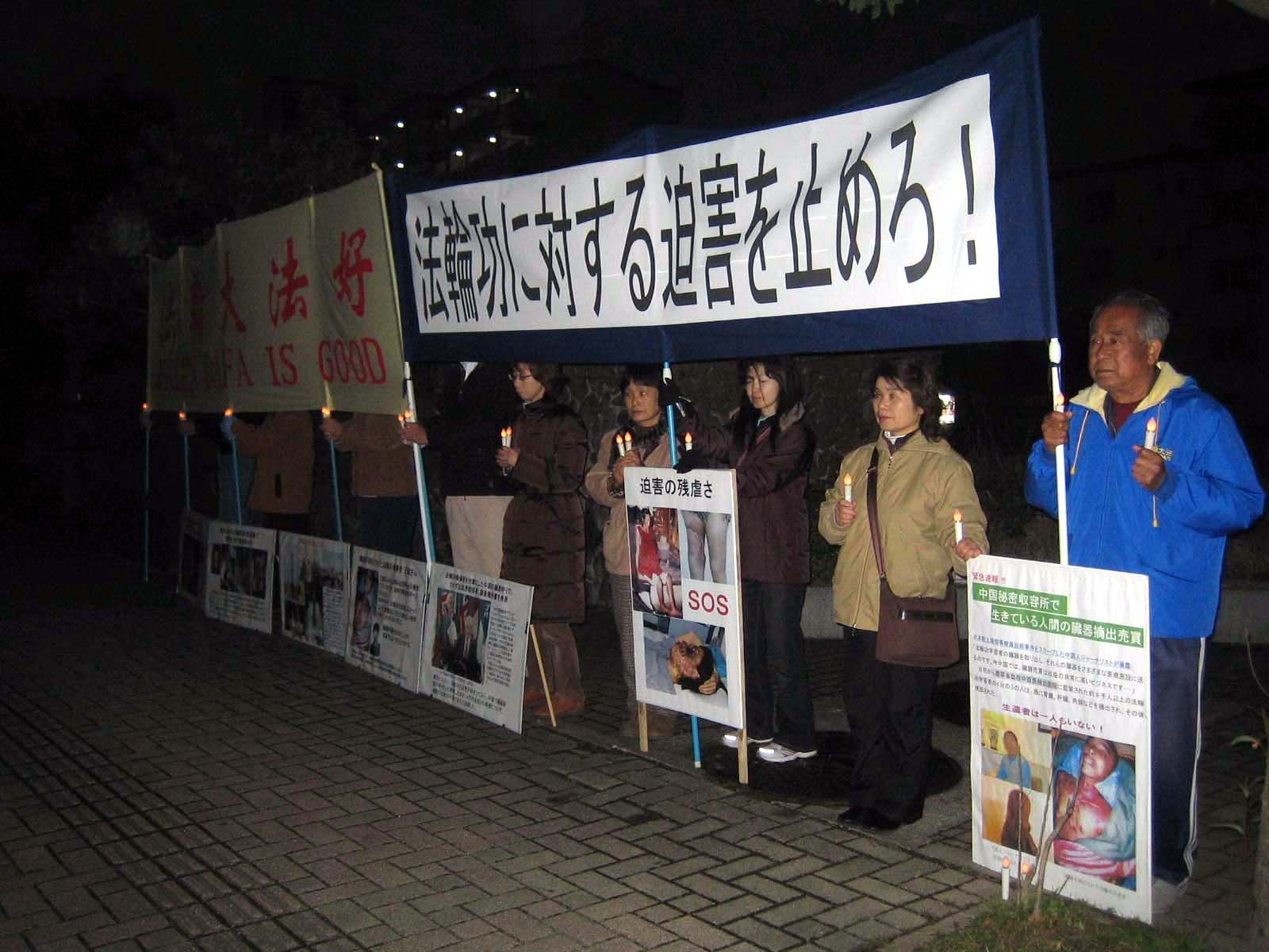 天黑了,法轮功学员点燃蜡烛,继续和平抗议 |