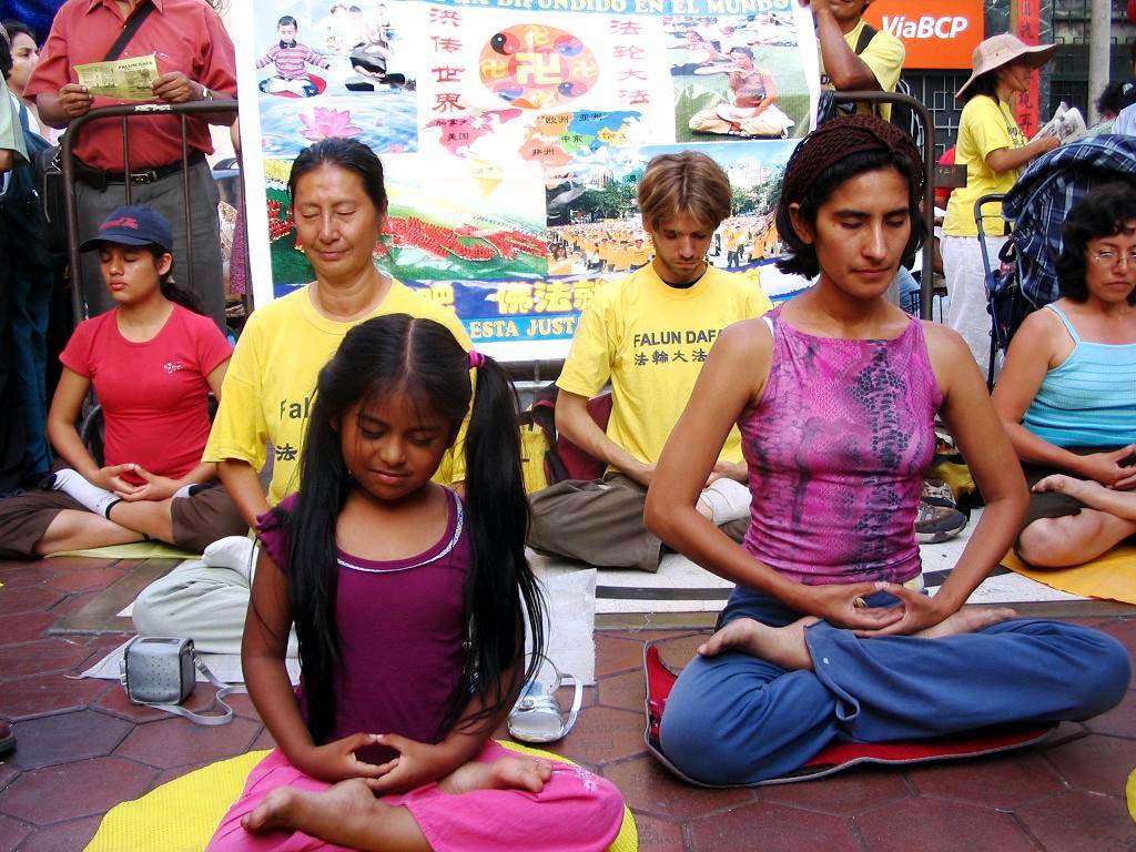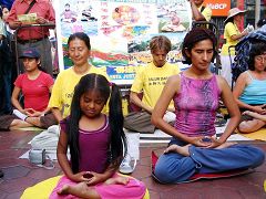 今天,学员们在演示平和、缓慢、舒展的五套法轮功功法时,被观看的民众围的里三层外三层的,尤其看到有五岁和六岁的两位小弟子的参与,人们显的十分的惊讶和震动,纷纷索取传单,询问学炼法轮功的情况。