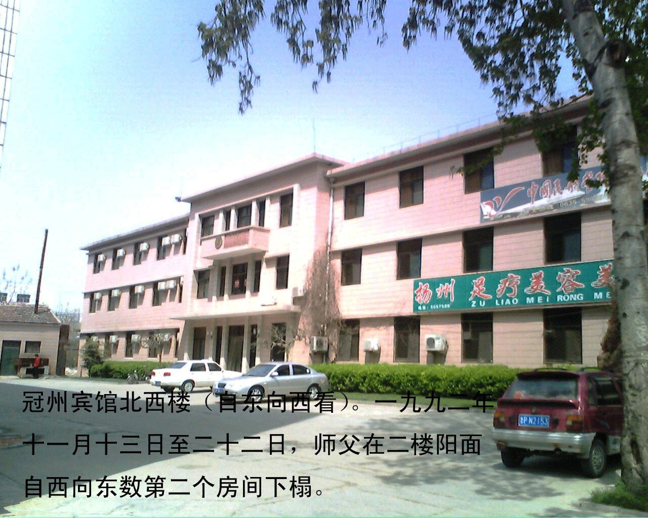 十一月十二日零点,老瑞和美荣二人乘老瑞的专车去邯郸火车站,早晨五点左右师父一行四人在邯郸下火车,然后乘老瑞的专车,走济邯公路,沿着后唐固北的这条柏油路進入冠县城。约七点多师父一行在红旗路中段桥北下车,在这个拐角处路南有一个小吃摊,师父到冠县的第一餐就是在这里吃的油条和豆浆。在吃饭的过程中,老瑞让师父住在他的家里,师父也答应了。吃完饭师父一行就到老干部活动中心和有关单位的领导见面,商量办班的有关事宜。当时参加会议的有公安局、民政局、老干局、体委、气功协会及某某功辅导站等方面的有关人员。在开会期间师父就为在场的与会人员调理身体。十一点半多,老瑞来请师父一行吃午饭,老干局周振达局长和老戴来作陪。吃午饭时师父告诉老瑞看病的人会很多,会添很多麻烦,所以就不住家里了。有人把师父安排在县委招待所贵宾楼,师父嫌费用高,只住了一宿就搬到西楼二楼的普通房间,直到二十三号早晨离开冠县。