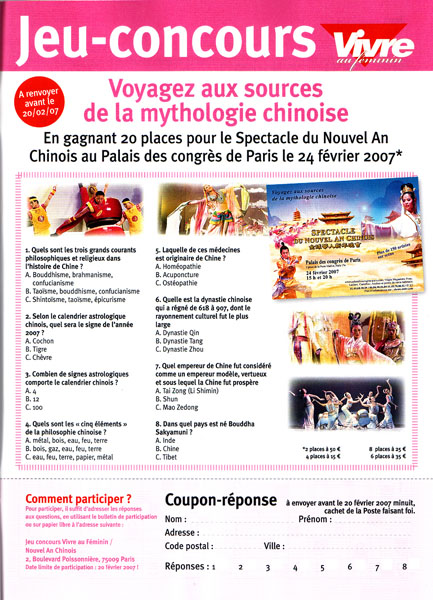 《Vivre au Feminin》杂志是一家很受欢迎的妇女杂志,每月发行量约十八万二千份。当了解到新!唐!人:全球华人新年晚会的消息后,该杂志编辑非常高兴,并表示愿意组织一次读者抽奖活动来宣传晚会,还撰写了一篇长达一页多的介绍性文章。
