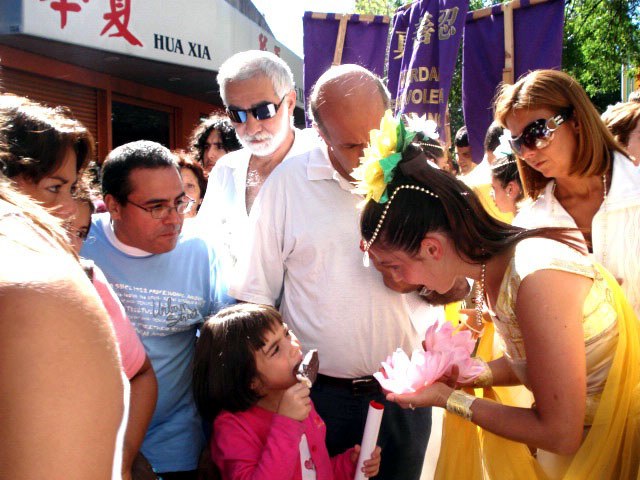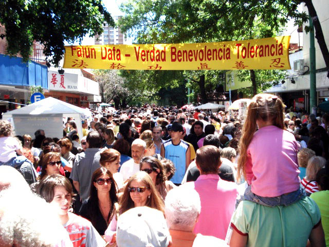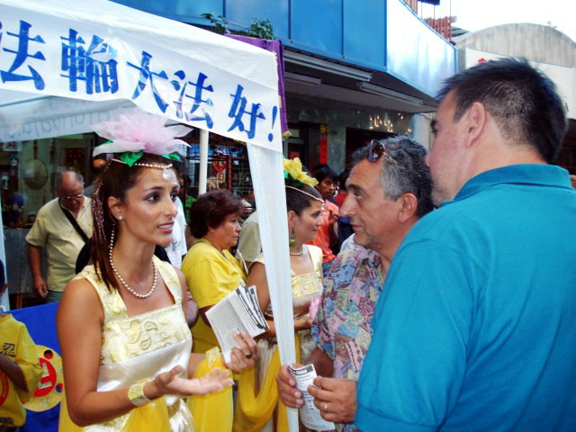 每次表演时,法轮功学员会发给观众传单,讲述她们为什么表演莲花舞。表演完后会介绍法轮功并讲述发生在中国的迫害真相。阿根廷人不停的说:太美了,太美了!并且关注的倾听真相。摊位上也挤满了人群拿传单,听真相。学员们没有料到有那么多的对法轮大法有兴趣的人,不得不一次又一次的加印传单。街上不停的听到人们听着歌声,手拿着传单念“法轮大法好”。晚上八点园游会结束前,学员在摊位前演示功法,再度引起轰动。