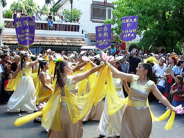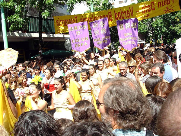阿根廷法轮大法学会如往年一样,参加并设置了摊位,在马路中间挂上写着“法轮功”的大型横幅标语。和往年不一样的是今年法轮功学员准备了一场莲花舞。学员们仿照缝制了仙女服装,配上头饰,莲花,以“法轮大法好”音乐伴奏,表演莲花舞。观众都说:舞者真的像下世的美丽仙女。