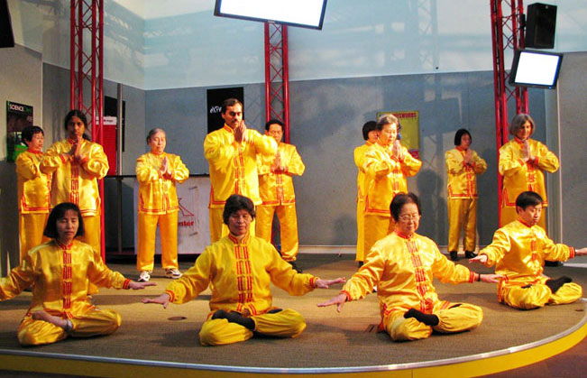 ![]() 舞台上的法轮功功法演示 |