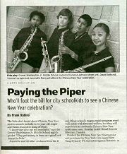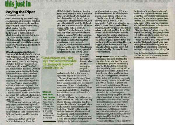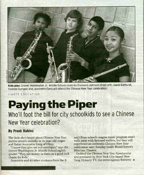 费城周报(Philadelphia Weekly)记者福兰克.鲁宾诺(Frank Rubino)一月十七日报导说,费城格罗瓦.华盛顿初中十四岁的简奈特.依杨(Jeannette Eang)会唱歌、吹长笛,当她和她的同学们知道要去看新!唐!人:的全球华人新年晚会的时候,高兴极了。