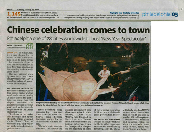 费城简讯报(The Bulletin)记者克里斯田.波里达若(Christian Polidoro)一月二十三日报导说,二零零四年新!唐!人:电视(NTDTV)的全球华人新年晚会刚开始时,只在全球的七个城市演出。随着这两年名气越来越大,她扩大到十七个城市的二十五场表演,但费城没有被列入日程。