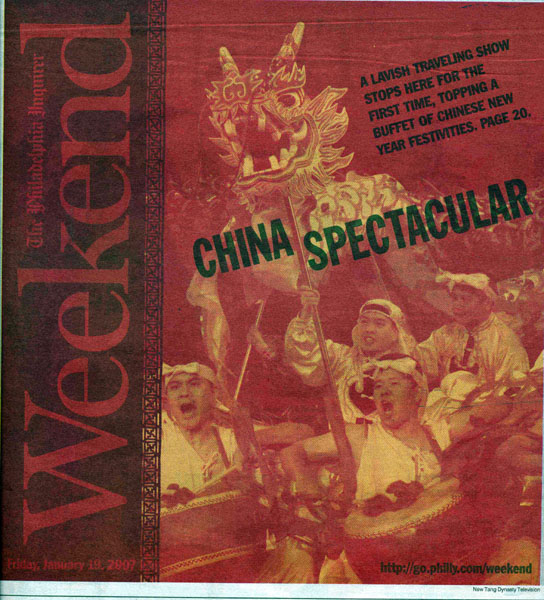 费城最大的报纸费城问询报( The Inquirer)不但赞助了晚会,并且在演出前的周末大篇幅的以三版报导了晚会。记者托尼·卡拉斯 (Toni Callas)一月十九日在文章写道,“以前费城居民需要到纽约去看中国新年晚会‘神话与传说’,今年在当地就可看到了,新!唐!人:晚会首次来到费城在美丽安剧院上演。演出突出中国的黄金年代--唐朝的艺术。猪年,始于二月十八日。”