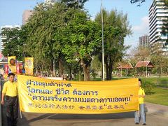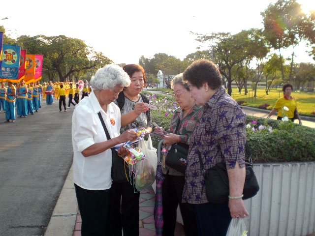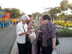 法轮功学员的游行队伍色彩亮丽,美好祥和,一路飘荡着「法轮大法好」的音乐,吸引了很多人驻足观看,他们有的露出惊叹的目光,有的高兴的接过法轮功学员分送的洪法资料、莲花、护身符等,有的还当即表示要提供支持和帮助,越来越多的人开始明白了法轮功真相。