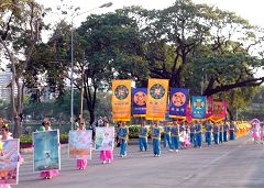 游行队伍的前面是「法轮大法好」、「世界需要真善忍」等横幅,后面紧跟着手捧「真善忍美展」作品的仙女、印有法轮图的洪法旗、腰鼓、龙旗、舞蹈队等,鼓声阵阵,彩旗翻飞,壮观浩荡。