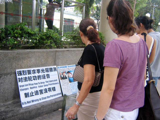 “十•二三乌节路诬告案”判决之后,法轮功学员首次将“强烈要求李光耀撤销对法轮功学员的诬告”、“李光耀:停止迫害法轮功”等展板带到新加坡街头。对长期处在李氏高压下、敢怒不敢言的新加坡人,是一个强烈的震撼,也向人们展示了法轮功学员不畏强暴、不畏艰险、在迫害中坚定的维护自己信仰的高贵品质。