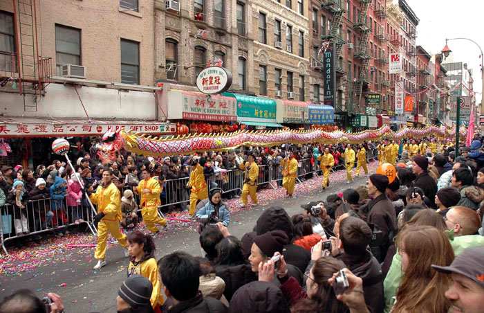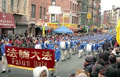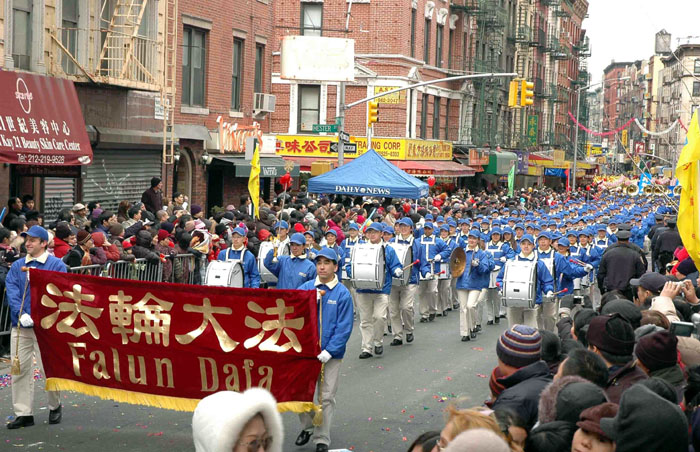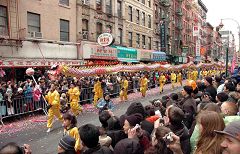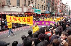 二零零七年二月二十五日,正月初八,中午时分,纽约最大也是最古老的中国城——华埠的街头,锣鼓喧天,人头攒动,人们正翘首以盼一年一度的华埠新年游行。据称,今年的新年游行,游行路线最长,几乎绕华埠一周;参加的社团人数众多,花车、彩旗、气球等,绵延数个街口;观看者也达历年之冠,整个游行路线两边几乎都挤满了观看的人群,里三层外三层。人们兴致勃勃,将冬日的寒冷也驱赶到别处去了。压轴的法轮功队伍,以其雄壮的乐团,生动的龙狮,祥和的炼功,祝福的仙女,欢快的腰鼓,将游行的乐章推到了最高潮,人们兴高采烈,皆有同感:看到法轮功队伍,真是不虚此行。