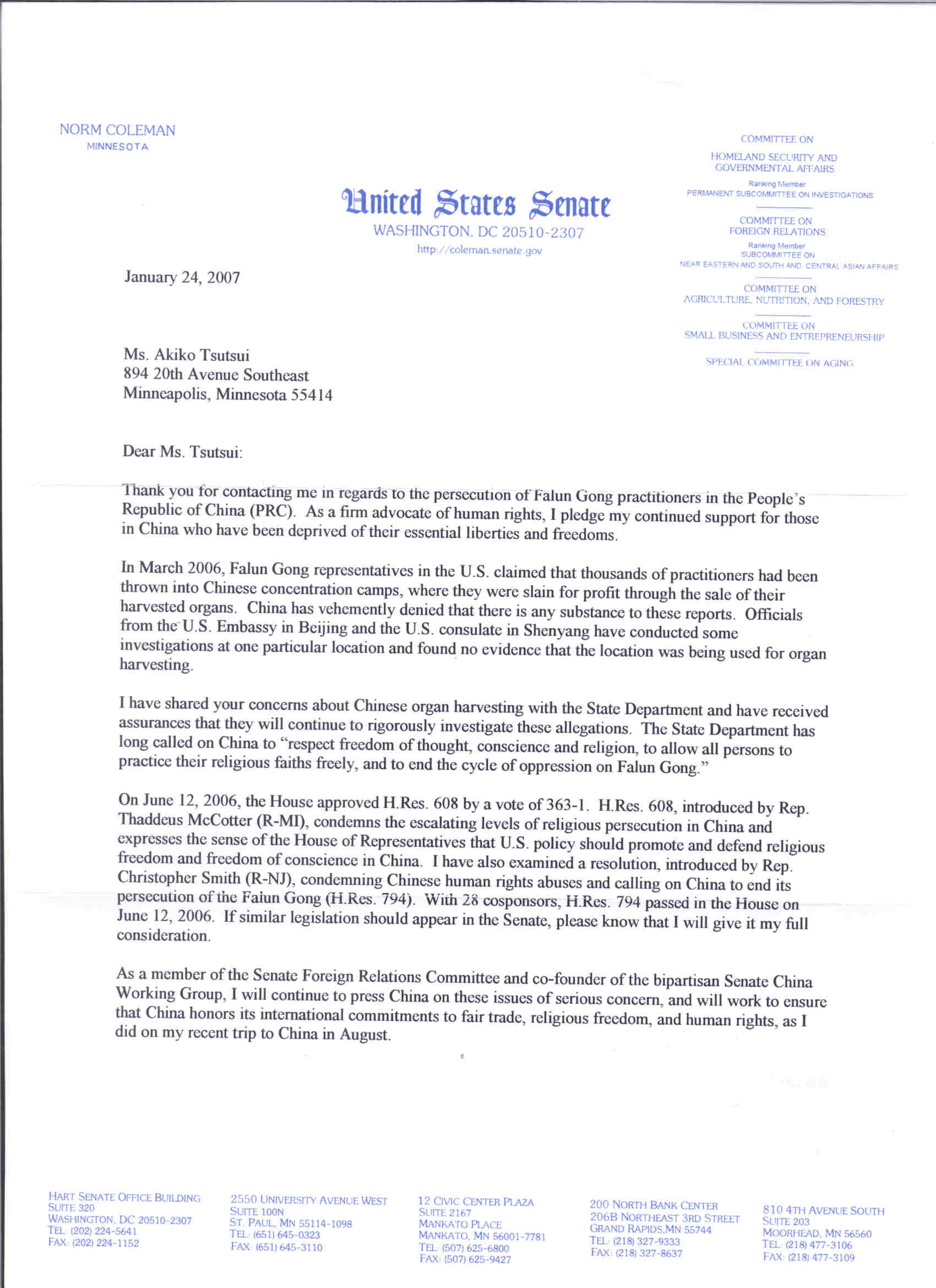 克尔曼表示他查阅了由共和党议员克里斯•史密斯(Christopher H. Smith)提起的794号议案 ,该议案谴责中共的人权侵犯行径,并要求中共结束对法轮功的迫害。794号议案于二零零六年六月十二日通过。克尔曼表示如果有类似的议案在参议院提出,他会认真考虑。