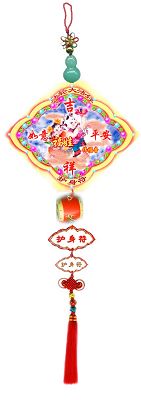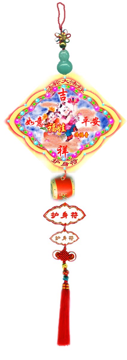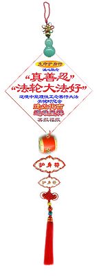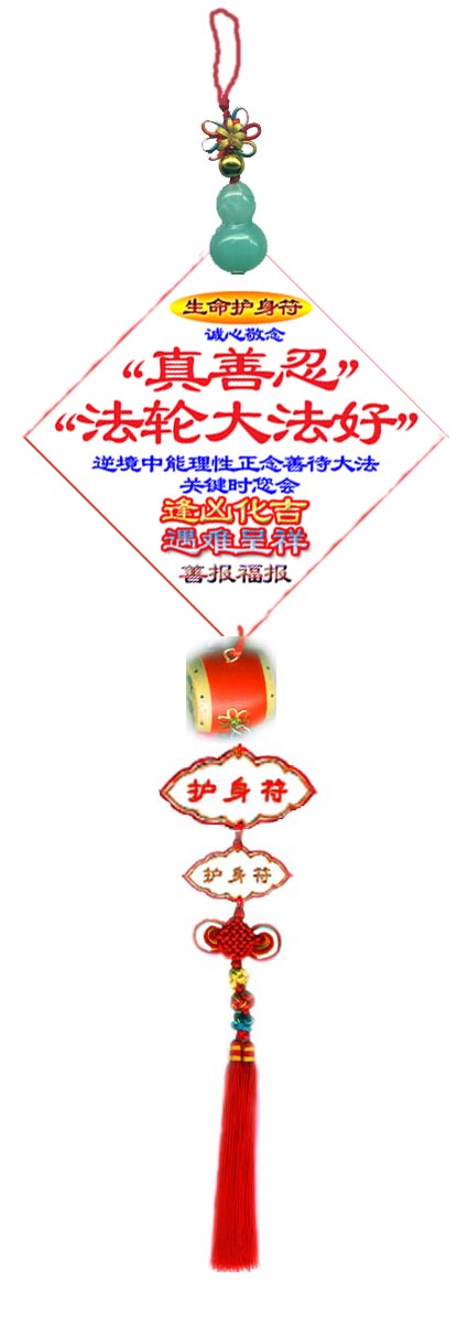 她给了我一个护身符卡片,上面写着:“法轮大法好”、“真善忍好”,背面写着:“诚念法轮大法好,吉祥如意百病消,心想法轮大法好,天灾人祸碰不着。”