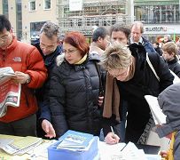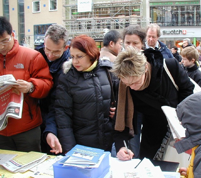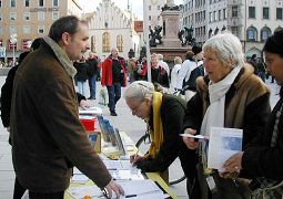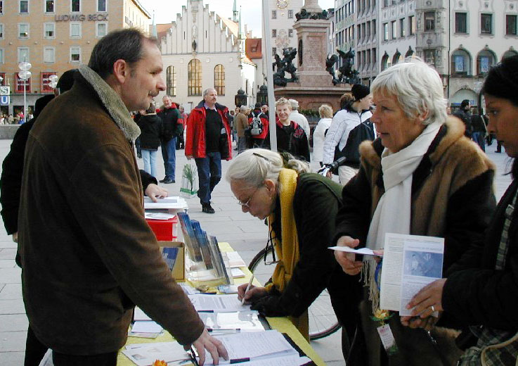 二零零七年二月三日,德国慕尼黑(Munich)的法轮功学员在市中心玛琳广场(Marienplatz)举办了声援一千八百万人退出中共及相关组织的活动,吸引了大量市民和游客的目光。人们仔细阅读了揭露中共迫害中国民众的展板,中共的所作所为,特别是中共活体摘取法轮功学员器官的滔天大罪,让观者感到震惊,更引发了人们对中共邪*党-的愤慨,人们纷纷签名对暴行表示抗议。
