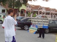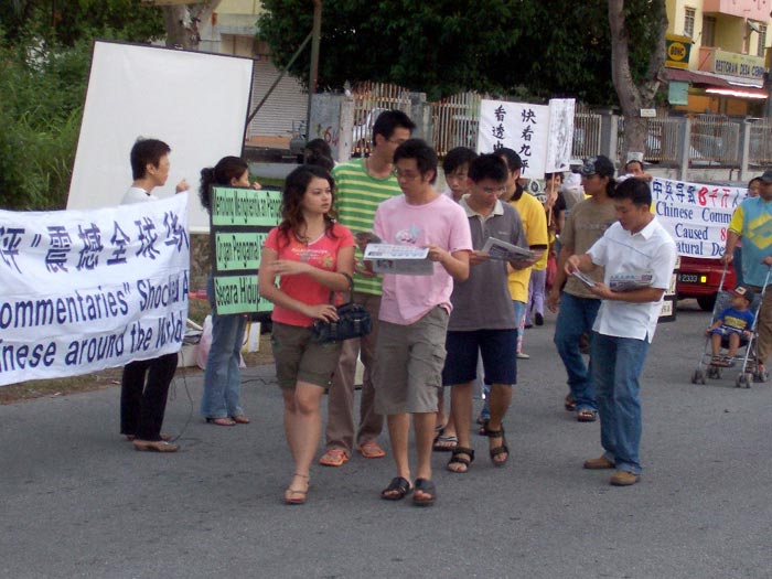 退!党!服务中心义工在傍晚时分到达夜市旁的马路旁,高举着多幅写有“声援一千八百万三:退.勇士”、“中共不等于中国、爱国不等于爱党”、“中共在解体 中国在新生”、“No Communism in Malaysia”(马来西亚拒绝共产邪恶主义)、“CCP IS OVER”(中共完蛋了)等展板,吸引了不少中国学生和各族人士驻足观看,大部份民众都收下了相关资料。