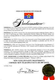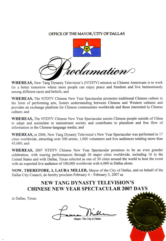 鉴于,二零零七年新!唐!人:全球华人新年晚会更加盛大,将在世界各地的二十六个主要城市巡回演出,包括美国的十六个城市;德克萨斯州的达拉斯市有幸被选为在全球举办晚会的三十个城市之一;预计在世界各地将吸引十万多现场观众,而达拉斯一地就有六千现场观众。