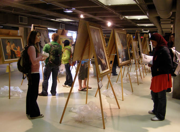 在MacEwan学生活动中心大楼举行的这一活动,由战争与和平、停止群体灭绝罪行、军队的觉醒等系列组成。在“停止群体灭绝罪行”部份,近三十幅画作把发生在中国、目前仍在持续的一场浩劫展现在人们眼前。