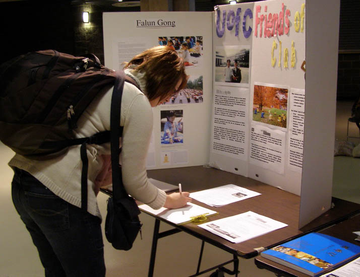 不少学生仔细观看了画展,表示难以置信在中国竟然还存在着如此严重的信仰迫害!并纷纷在“法轮功之友”的签名本上签字,声援和支持法轮功团体的反迫害行动。