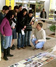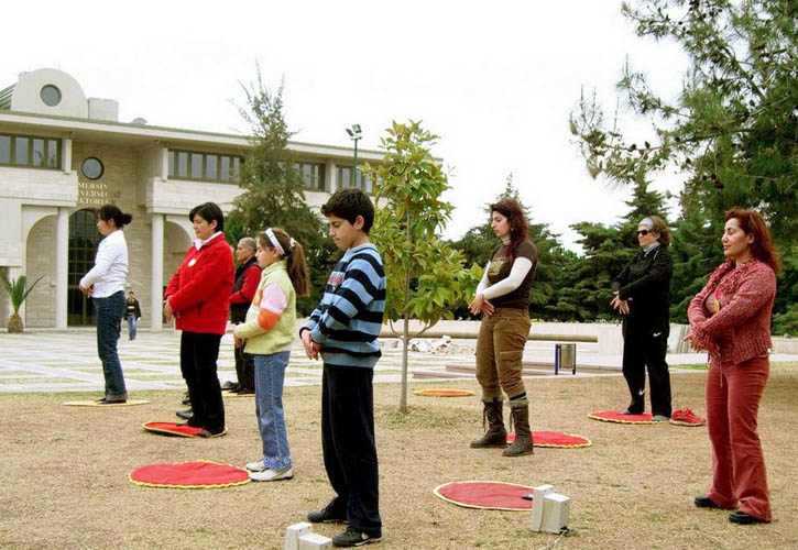 在校园的主操场旁边,法轮功学员们一边演示法轮功功法,一边向往来的师生们揭露中共残酷迫害法轮功的罪行。与此同时,能容纳上百人的校艺术中心放映厅,每小时一次的反复播放影片“法轮大法洪传世界”。