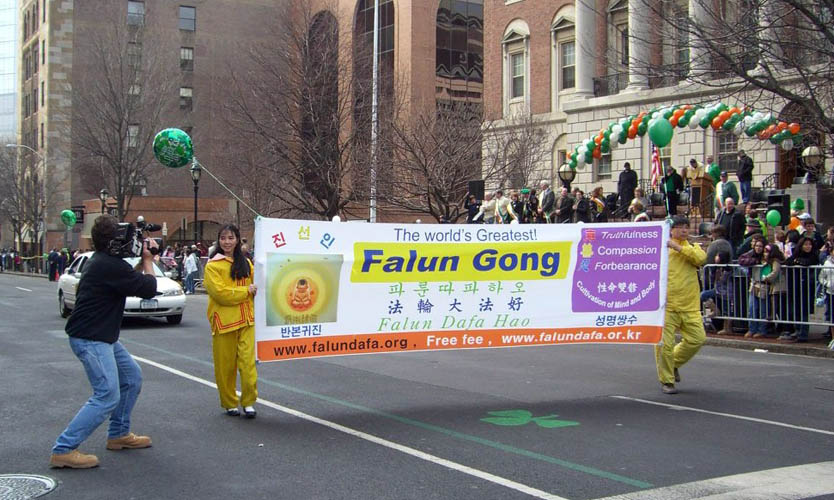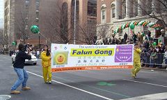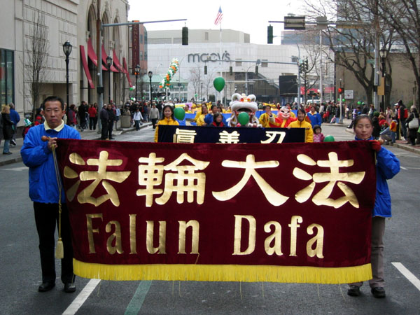 法轮功队伍以庄严醒目的中英文横幅“法轮大法”和“真善忍”领队,其后的银狮和大头娃娃特别吸引观众的注意力。银狮左顾右盼,或蹲或立,或停或走,神气活现;大头娃娃开心一笑,带来节日的喜庆。