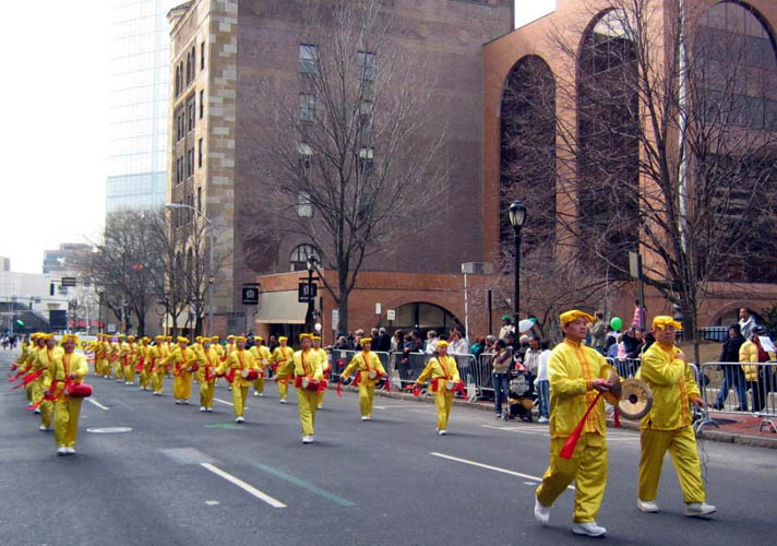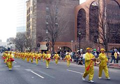 炼功队在行进中同时展示法轮功五套功法中的第一套“佛展千手法”和第三套“贯通两极法”。年轻人们身穿黄色镶红边的传统炼功服,动作舒展,祥和美好,充满喜悦。