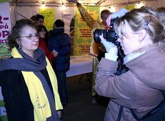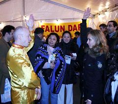 ![]() 法轮功学员展台的热闹场面吸引了记者来采访和拍照 |