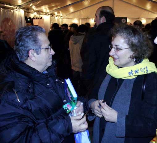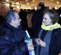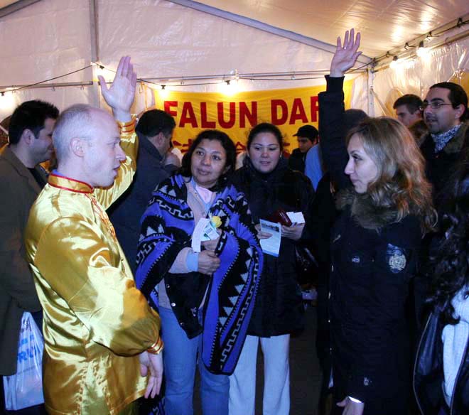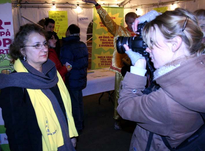 晚上六点开始,展位刚刚摆出就来了一位年轻的中国女孩和她伊朗裔的男朋友。一位法轮功学员迎上去和他们打招呼,祝他们新年快乐!并对那个中国女孩说,我们怎么那么面熟啊,好象在哪儿见过似的。那个女孩说:我想起来了,在街上你曾给我发过报纸。两人很快就熟络的聊了起来,原来这个女孩刚从中国出来不到半年,她很喜欢瑞典。