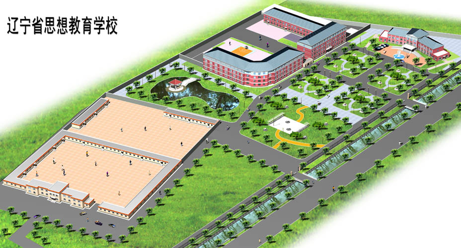 非法关押法轮功学员的是红色的楼,挂牌为所谓的“辽宁思想教育学校”(邪恶洗脑中心)。