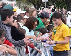 当人们看到花车上东、西方学员演示第五套功法时,许多人伸手索要法轮功简介传单,有些人还跑上前来索要传单,还有的人在模仿着学员的炼功动作。