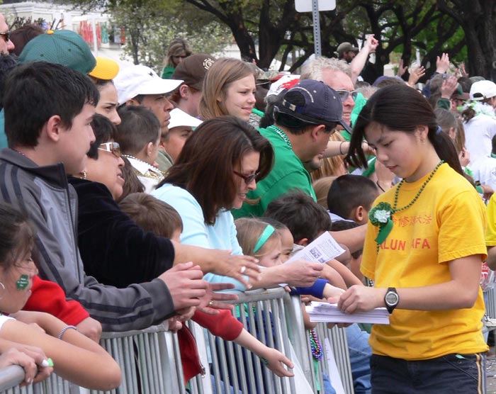 圣•派翠克日(St.Patrick'sDay)大游行,是达拉斯地区大型的游行之一,每年都吸引数万人观看。法轮功学员张女士介绍说:“游行始于一九七九年,到今年已是第二十八届。参加游行的各种团体有上百个。今年是我们第二次参加这个活动,希望通过这个活动使更多的人们了解真相,了解大法的美好!”一路上一直忙着派发传单的刘女士说:“人真多呀,许多人伸手要我们的资料。准备的五千份传单早就发完了。”