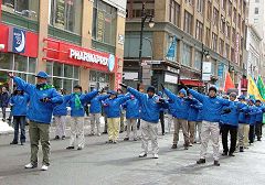 法轮功学员组成的游行队伍,以阵容强大的炼功方队为主,配上狮子舞、腰鼓及花车,格外引人注目,因其色彩明亮,音乐祥和清新,狮子舞、腰鼓与功法展示动静结合、刚柔相济博得了观众的喝彩和掌声,人们由衷的赞叹:非常好(Very Nice)!
