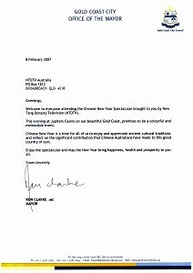 黄金海岸市长RON CLARKE在贺信中表示欢迎所有参加新!唐!人:新年晚会的观众。他说,在美丽的黄金海岸的木星剧场上演的这台晚会将是多彩而且值得永久纪念的。